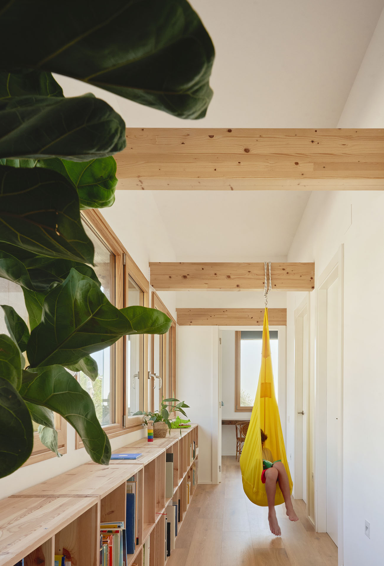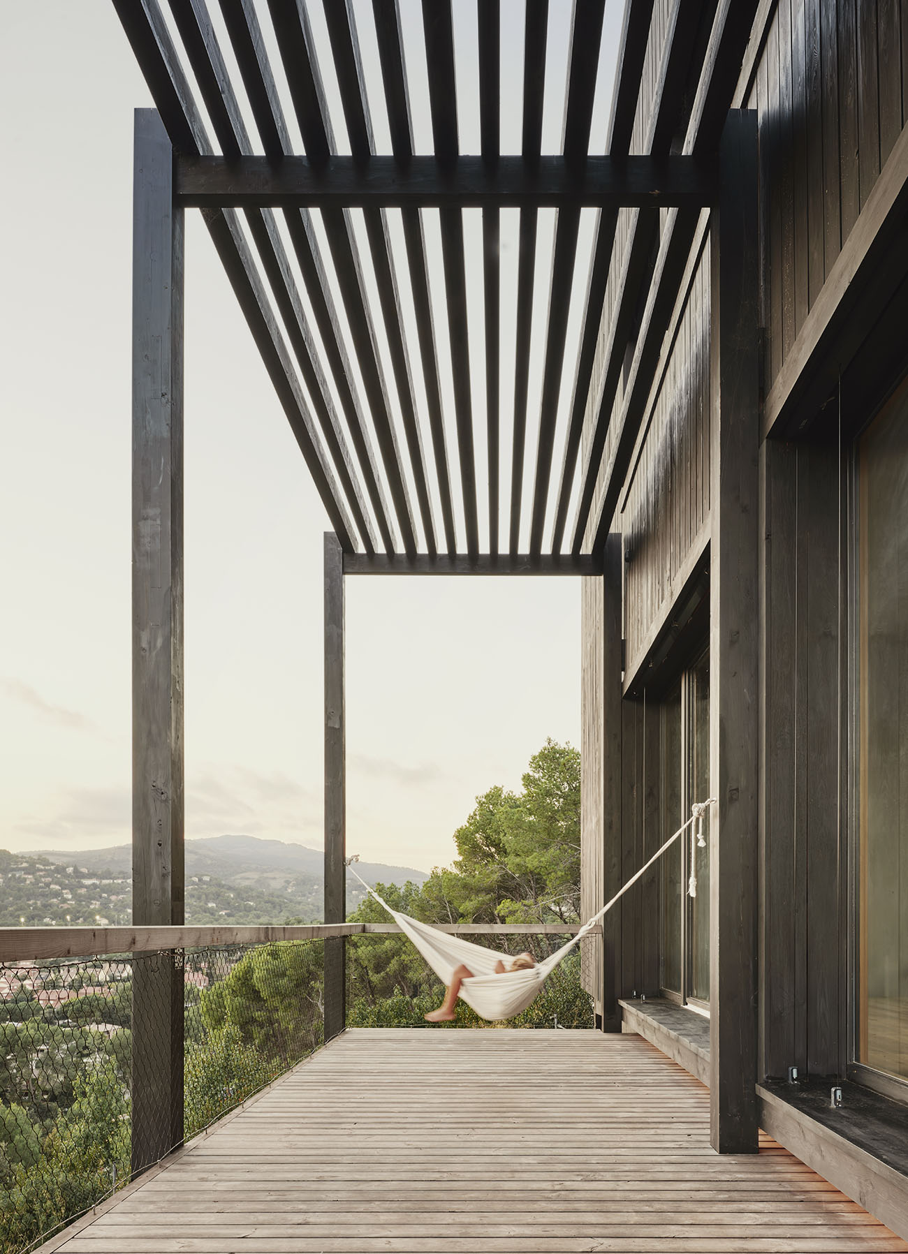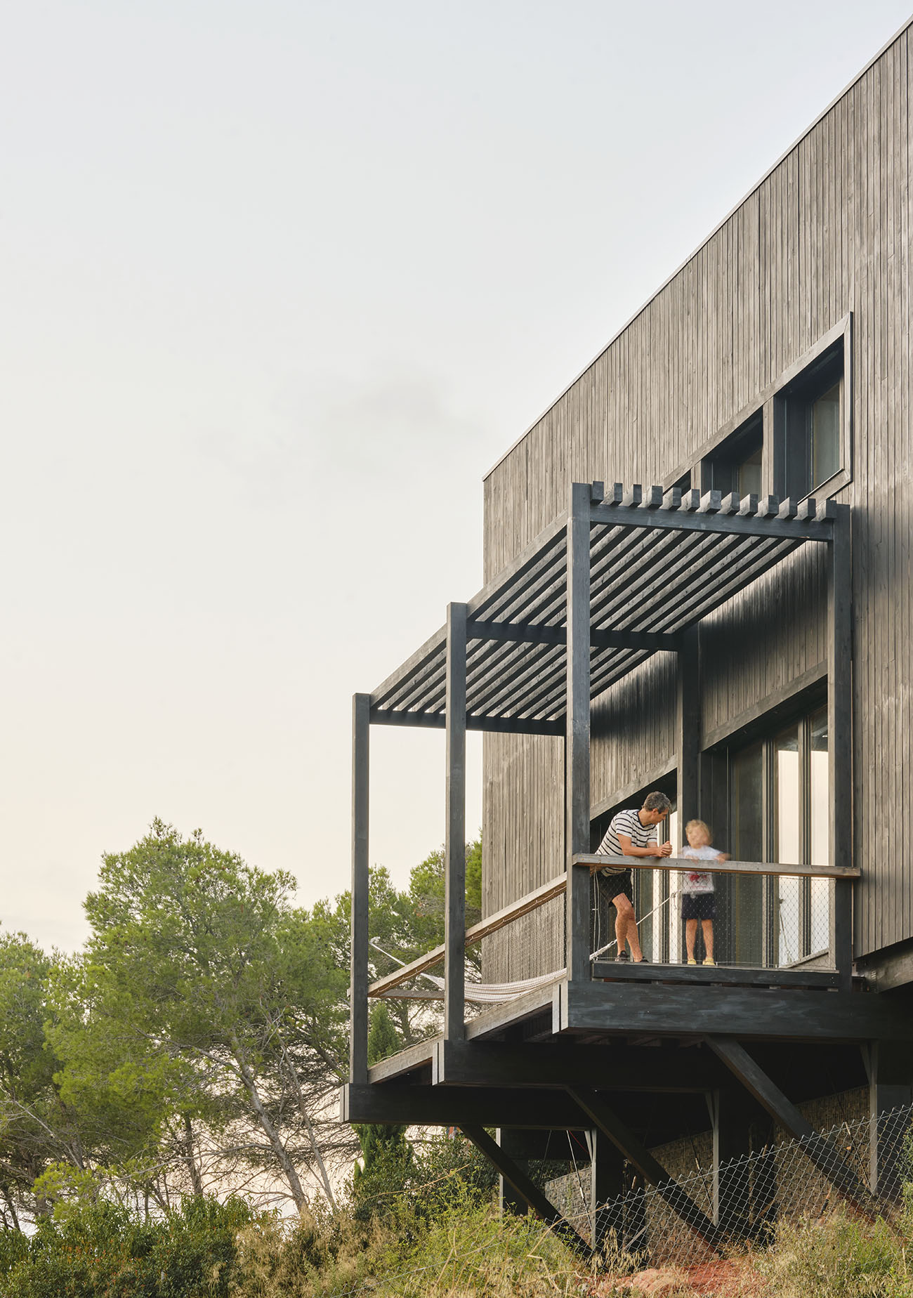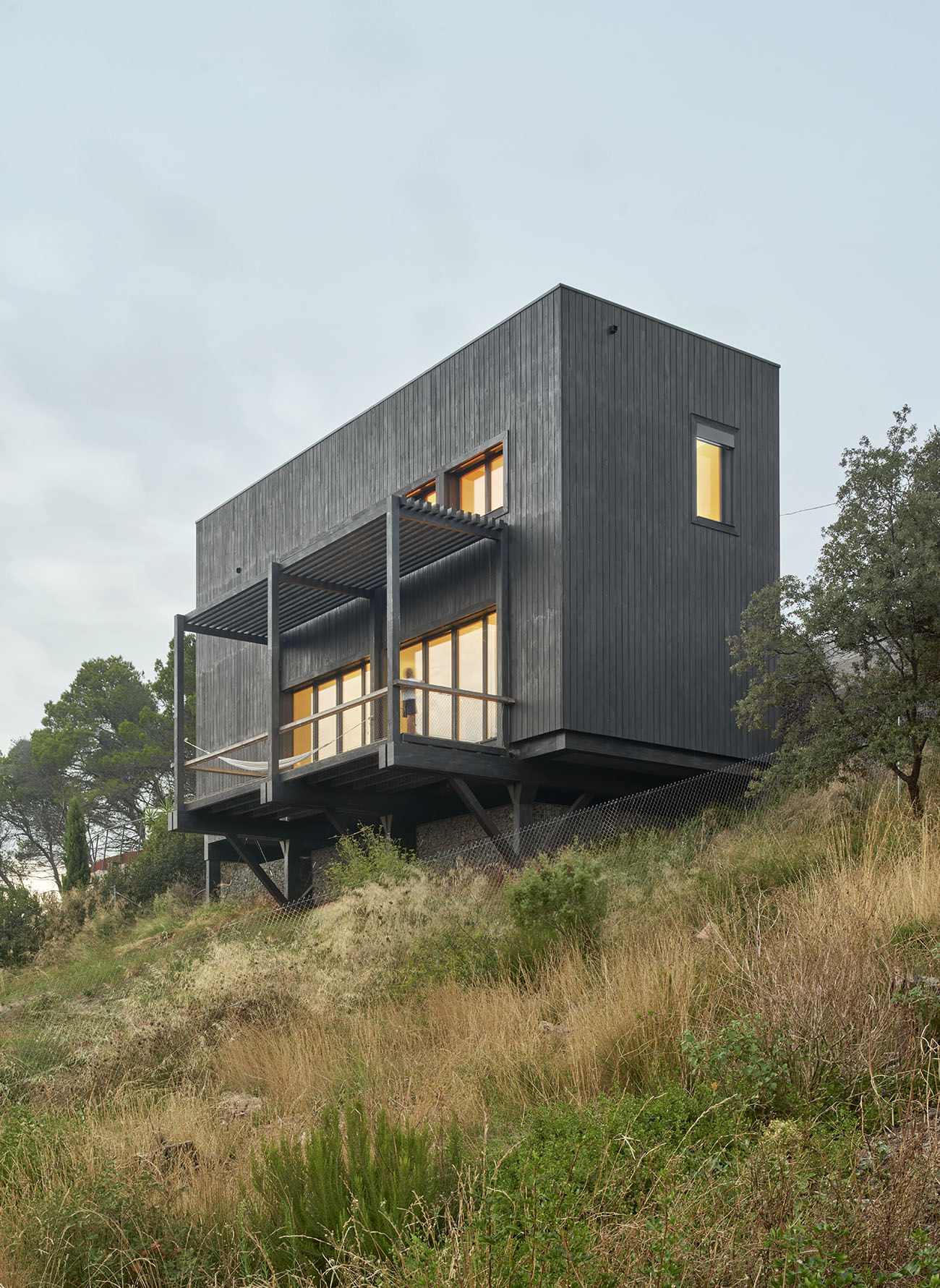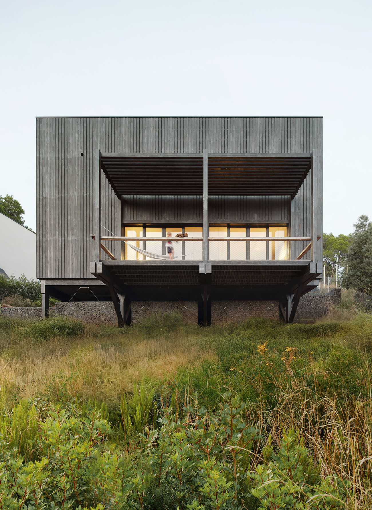 El volumen, compacto y preciso, se abre a un gran espacio porchado que se proyecta hacia el vacío. Ese umbral, suspendido entre la casa y el paisaje, es el corazón de la vida cotidiana: un lugar dónde pasar horas colgado de una hamaca, cenar bajo las estrellas o contemplar el horizonte en silencio.