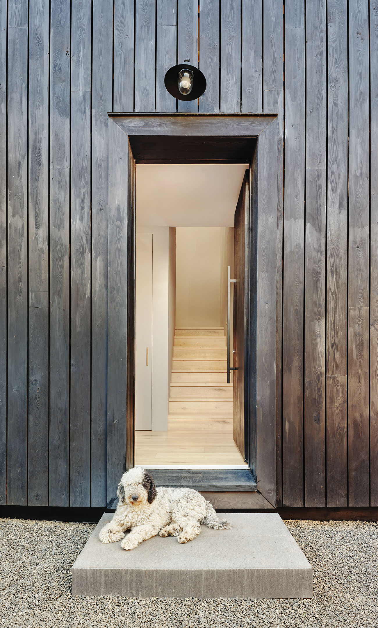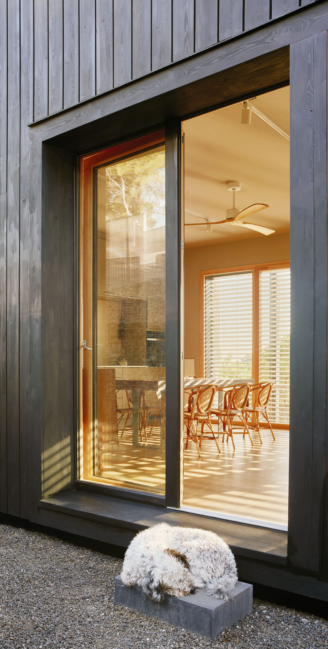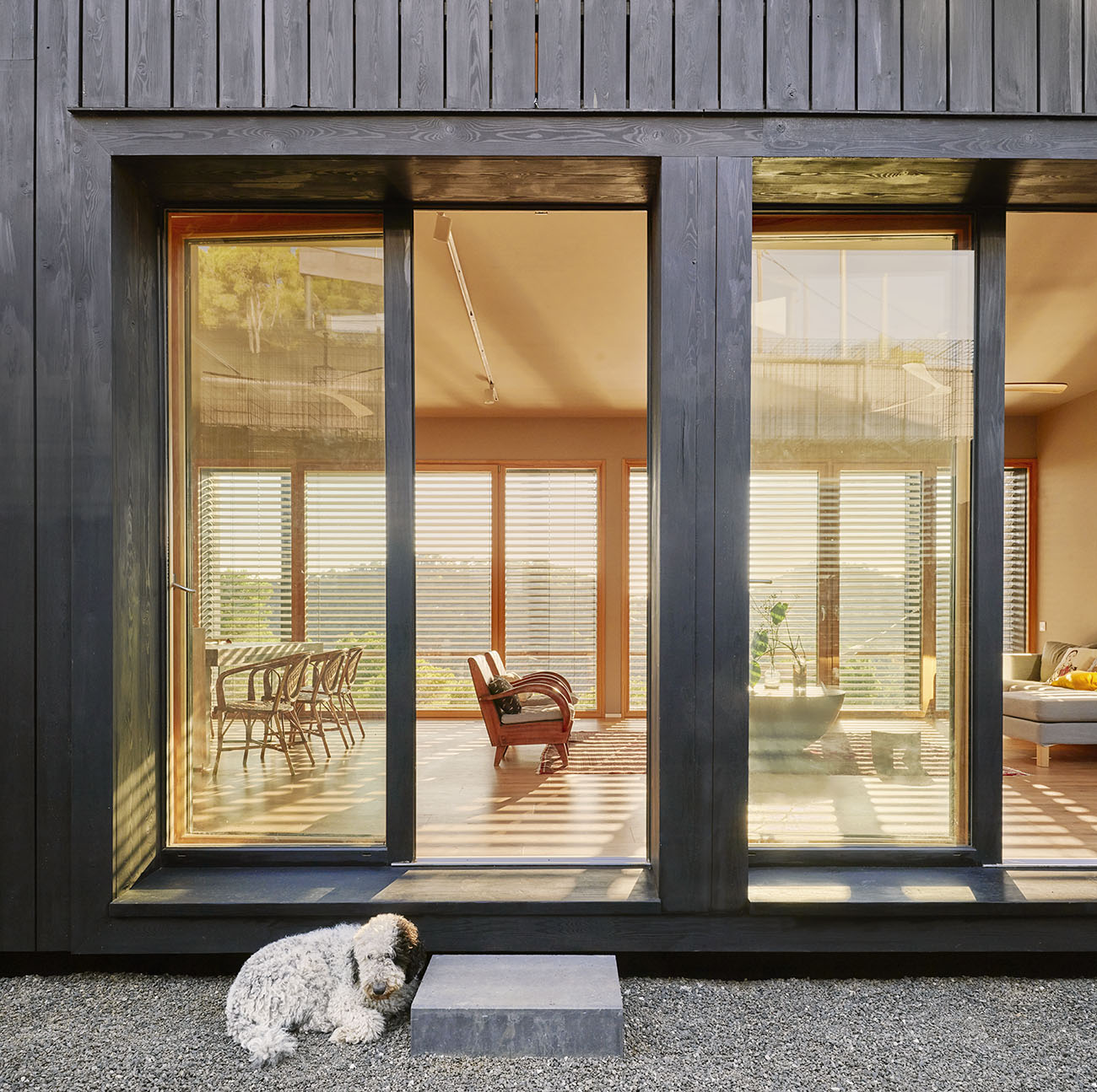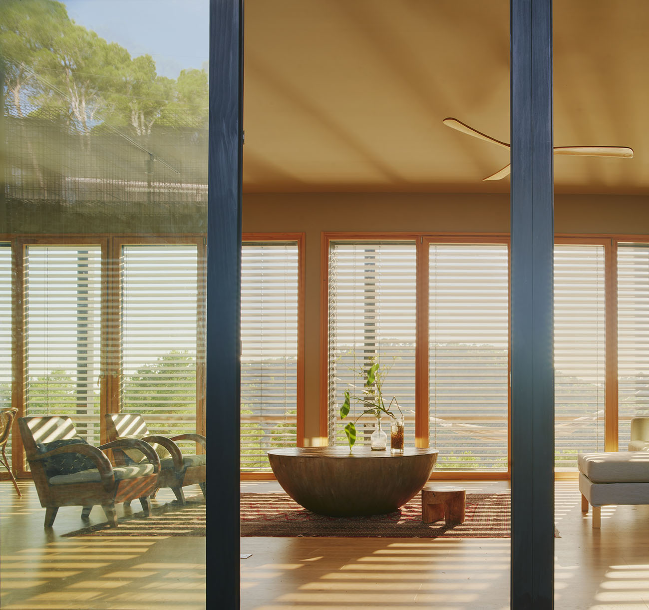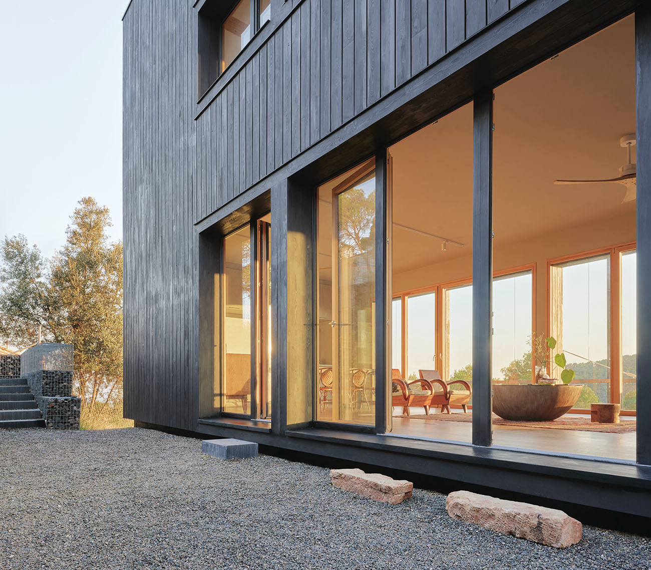 El volumen, compacto y preciso, se abre a un gran espacio porchado que se proyecta hacia el vacío. Ese umbral, suspendido entre la casa y el paisaje, es el corazón de la vida cotidiana: un lugar dónde pasar horas colgado de una hamaca, cenar bajo las estrellas o contemplar el horizonte en silencio.